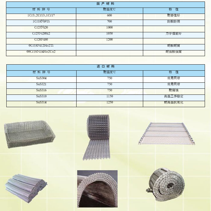 本公司生產(chǎn)的金屬網(wǎng)帶生產(chǎn)工藝先進(jìn),選材合理、品種規(guī)格齊全,有人字形、網(wǎng)狀形、方孔形等,是目前國(guó)內(nèi)熱處理、粉末冶金、化纖和玻璃二次加工等行業(yè)自動(dòng)生產(chǎn)線中的關(guān)鍵配件。